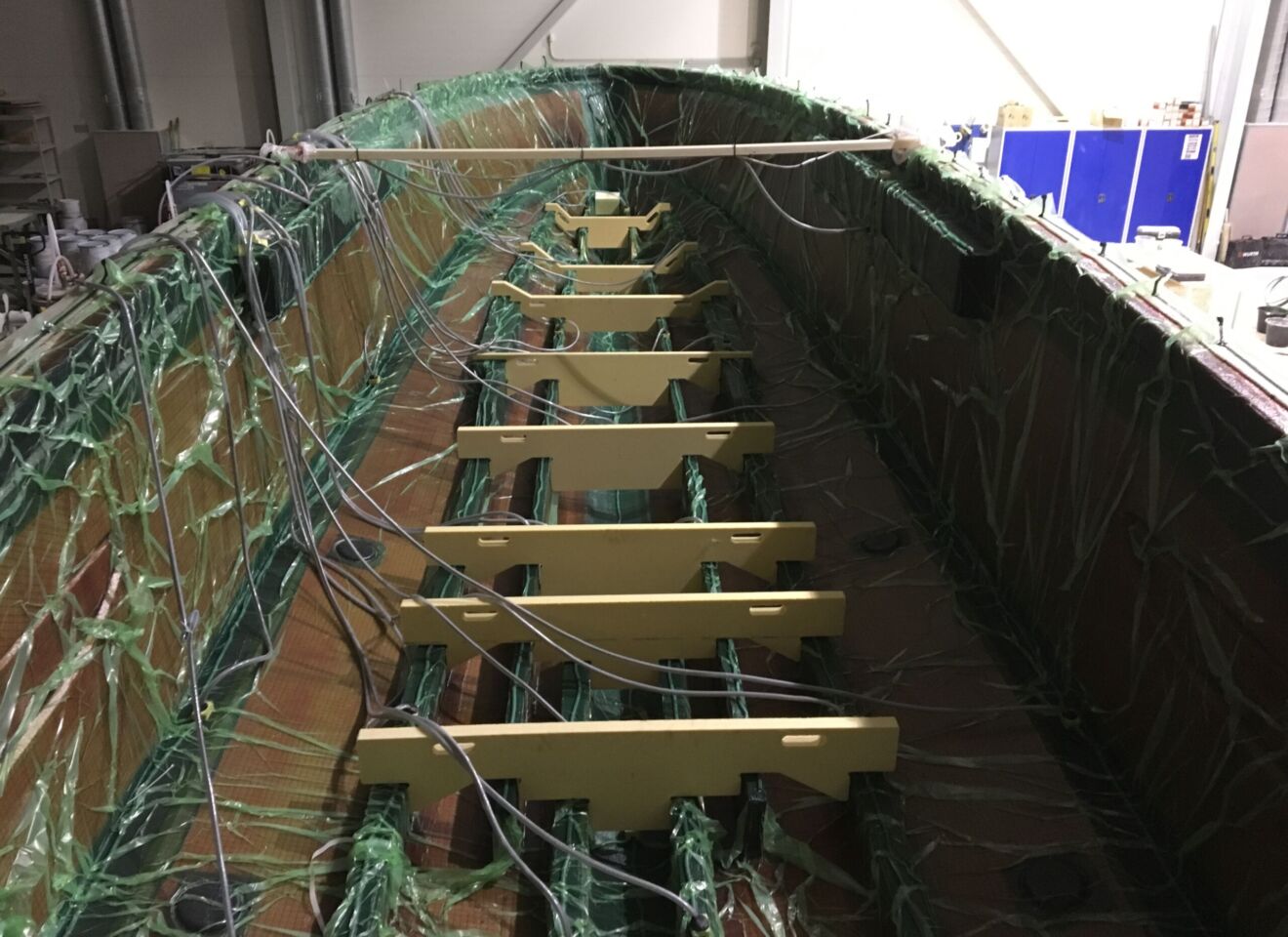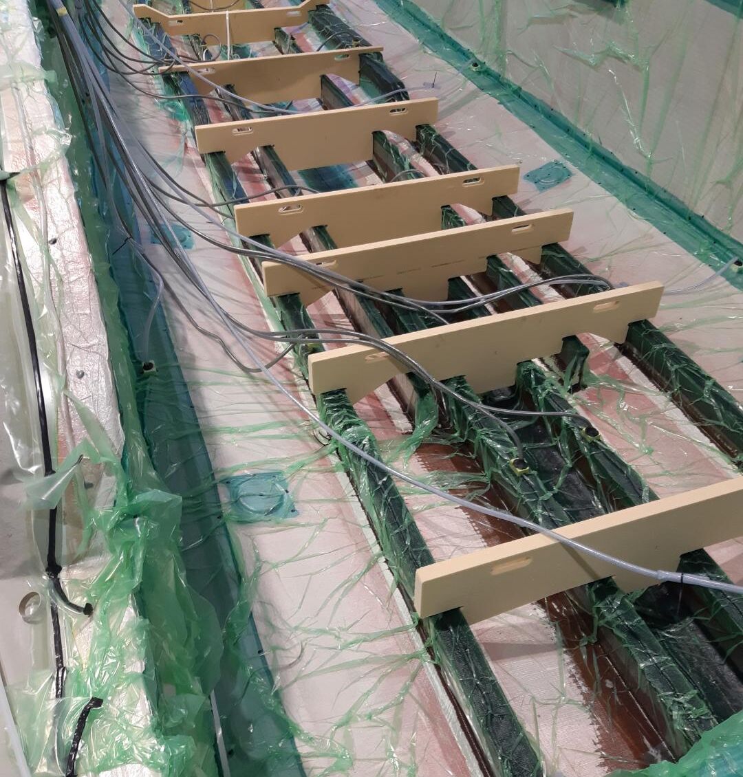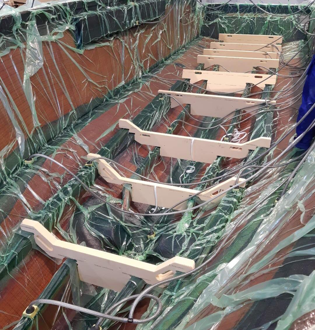 Vacuum infusion (also called Resin Infusion) is an industry wide term describing a composite manufacturing process whereby the fabric reinforcement and resin are prepared separately. Resin infusion is used in open moulded composite manufacture and involves the tailoring, positioning and laying up of all the reinforcement fabric in a dry state, followed by the application of the vacuum bag. Before the mould is fully sealed, various inlet taps are positioned and linked into a network for introducing the liquid resin. The physics behind the process means that because of a pressure differential the resin is “sucked” up the inlet tubes and dispersed across the dry fabrics, sometimes aided by channels or grooves in the core material, or mesh that is designed to aid uniform fluid flow.