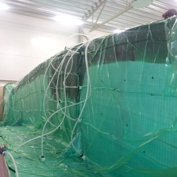 Resin infusion is used in open moulded composite manufacture and involves the tailoring, positioning and laying up of all the reinforcement fabric in a dry state, followed by the application of the vacuum bag. Before the mould is fully sealed, various inlet taps are positioned and linked into a network for introducing the liquid resin. The physics behind the process means that because of a pressure differential the resin is “sucked” up the inlet tubes and dispersed across the dry fabrics, sometimes aided by channels or grooves in the core material, or mesh that is designed to aid uniform fluid flow.